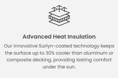 Premium decking that looks great and smartly drains. Additional Surlyn surface enhances visual appeal and durability, while smartly designed grooves enable water to drain efficiently with less puddling, and provide more wet safety.